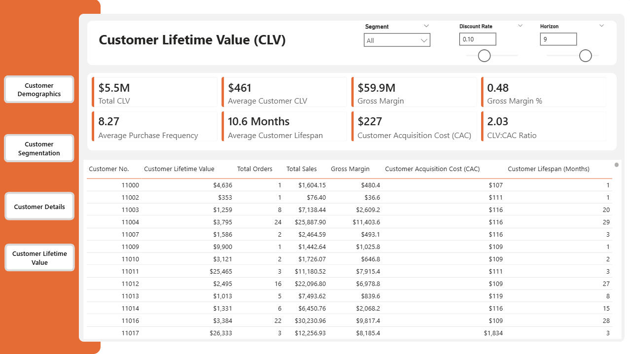 Drill‑through list to activate campaigns (filterable customer‑level view).Customer Lifetime Value (CLV)
