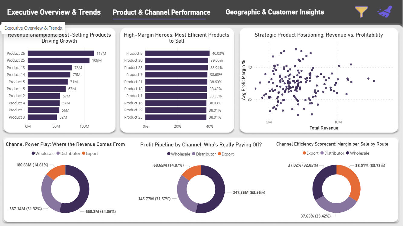- Interactive Slicers – Year, channel, and region filters for dynamic explorationPage 2: Product & Channel Performance