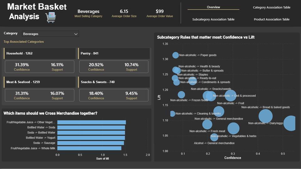 5. Exported ranked CSVs and surfaced top rules inside Power BI for interactive prioritization.---Dashboard visuals- KPI header: top category + average items per order + average order value for immediate context.