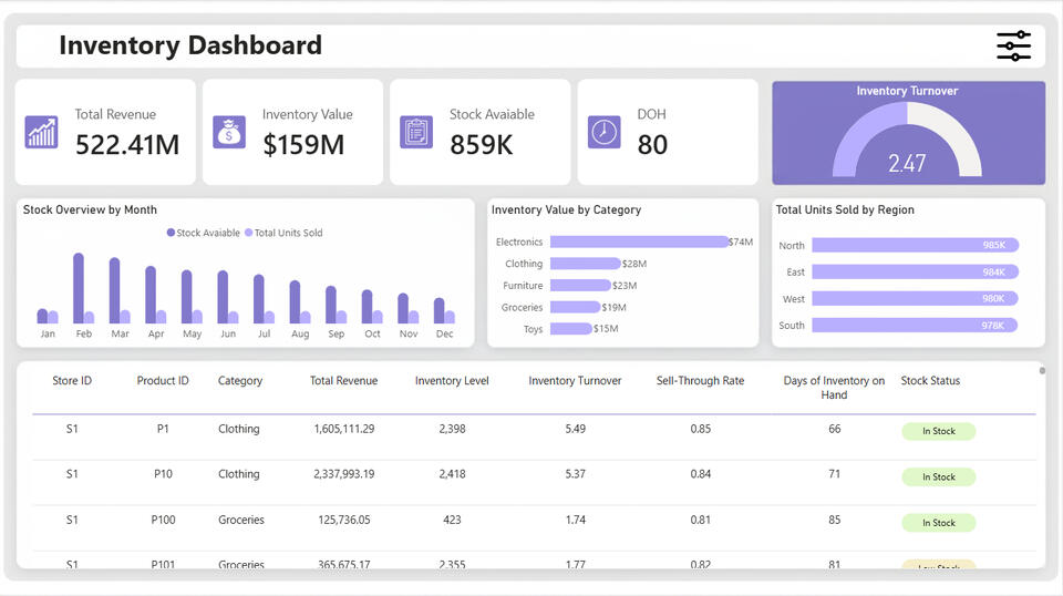 Problem statementRetail teams struggle to know which SKUs are fast vs slow moving, how long current stock will last, and which categories/regions need replenishment — especially around seasonal/festival demand spikes. This dashboard centralizes the answers and provides operational actions (reorder, promotion, transfer).DataInput: CSV with fields including date, storeID, productID, category, region, inventoryLevel, unitsSold, unitsOrdered, price, discount, plus contextual columns (seasonality, weather, holiday). (Data covered from 2022–2024.)Tools & techPower BI Desktop, DAX, Power Query (M), PowerPoint (wireframes & background art), basic SVG for image statuses, CSV dataset.Key metrics & formulas (high-level)Below are the principal measures implemented (copyable DAX provided in README section):- Total Units Sold — SUM of UnitsSold- Stock Available — SUM of InventoryLevel- Inventory Value — on-hand value considering discounts (InventoryLevel × Price or Price*(1−Discount) when discount exists).- Total Revenue — UnitsSold × Price (accounting for discounts).- Average Inventory (monthly) — monthly average of inventory used to compute turnover.- Inventory Turnover — TotalUnitsSold / AverageInventory.- Sell-through Rate — TotalUnitsSold / (TotalUnitsSold + StockAvailable).- Days of Inventory on Hand — AverageInventory / AverageDailySales (used for procurement lead-time planning).Visuals & interaction- KPI cards: Revenue, Inventory value, Stock available, Days OIH.- Gauge: Inventory turnover ratio.- Monthly stock overview: Clustered column comparing units sold vs stock available (chronological sorting via MonthNumber).- Inventory value by category / units sold by region: horizontal bars with data labels & rounded edges.- Detailed table: storeID, productID, category, units sold, revenue, inventory level, turnover, sell-through, days OIH, and an image/SVG status (in-stock / low-stock / out-of-stock).- UX: Filter “pin” with Year / Month / Region / Store / Category / Product slicers, bookmark-driven open/close and reset buttons (preserves selection state).What I learned- Designing pixel-perfect Power BI backgrounds and using bookmarks for polished UX.- How to translate inventory theory (ABC, safety stock, festival demand) into practical DAX measures and visual triggers.