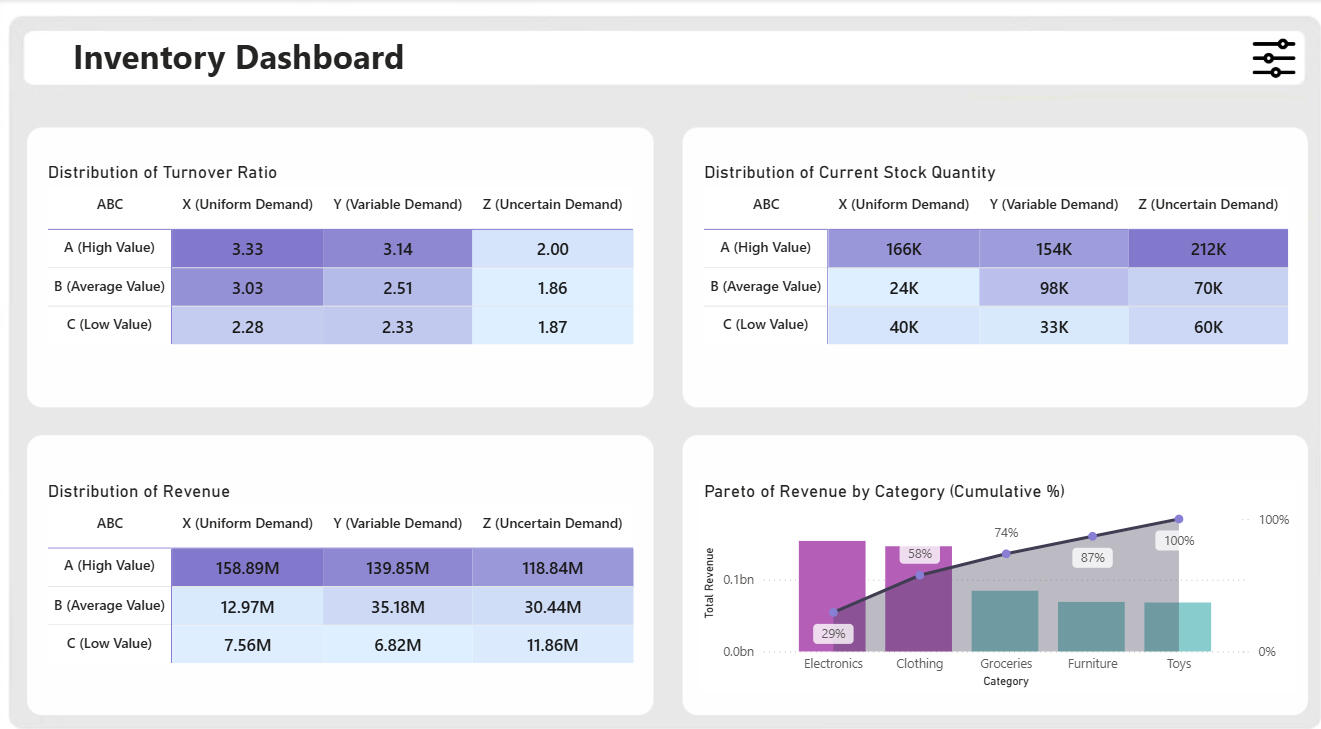 Problem statementRetail teams struggle to know which SKUs are fast vs slow moving, how long current stock will last, and which categories/regions need replenishment — especially around seasonal/festival demand spikes. This dashboard centralizes the answers and provides operational actions (reorder, promotion, transfer).DataInput: CSV with fields including date, storeID, productID, category, region, inventoryLevel, unitsSold, unitsOrdered, price, discount, plus contextual columns (seasonality, weather, holiday). (Data covered from 2022–2024.)Tools & techPower BI Desktop, DAX, Power Query (M), PowerPoint (wireframes & background art), basic SVG for image statuses, CSV dataset.Key metrics & formulas (high-level)Below are the principal measures implemented (copyable DAX provided in README section):- Total Units Sold — SUM of UnitsSold- Stock Available — SUM of InventoryLevel- Inventory Value — on-hand value considering discounts (InventoryLevel × Price or Price*(1−Discount) when discount exists).- Total Revenue — UnitsSold × Price (accounting for discounts).- Average Inventory (monthly) — monthly average of inventory used to compute turnover.- Inventory Turnover — TotalUnitsSold / AverageInventory.- Sell-through Rate — TotalUnitsSold / (TotalUnitsSold + StockAvailable).- Days of Inventory on Hand — AverageInventory / AverageDailySales (used for procurement lead-time planning).Visuals & interaction- KPI cards: Revenue, Inventory value, Stock available, Days OIH.- Gauge: Inventory turnover ratio.- Monthly stock overview: Clustered column comparing units sold vs stock available (chronological sorting via MonthNumber).- Inventory value by category / units sold by region: horizontal bars with data labels & rounded edges.- Detailed table: storeID, productID, category, units sold, revenue, inventory level, turnover, sell-through, days OIH, and an image/SVG status (in-stock / low-stock / out-of-stock).- UX: Filter “pin” with Year / Month / Region / Store / Category / Product slicers, bookmark-driven open/close and reset buttons (preserves selection state).What I learned- Designing pixel-perfect Power BI backgrounds and using bookmarks for polished UX.- How to translate inventory theory (ABC, safety stock, festival demand) into practical DAX measures and visual triggers.